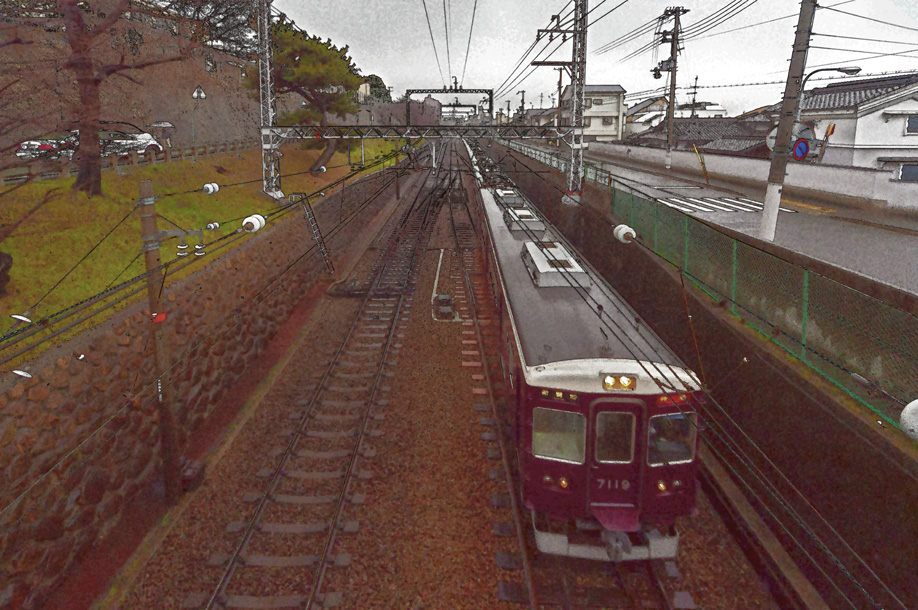 阪急電車の外装カラーリングには、伝統的にマルーン色(阪急マルーン。お召し列車でも用いられる色)が採用されているほか、内装についても木目調の化粧板やゴールデンオリーブ色のアンゴラ山羊の毛のシートを採用するなど統一されています。スケッチの電車は、阪急7000系電車です。1980年(昭和55年)から1988年(昭和63年)まで製造された阪急電鉄の通勤形電車で、わりと乗り心地は、良いと思いますが、機会があれば、ぜひお試しください。